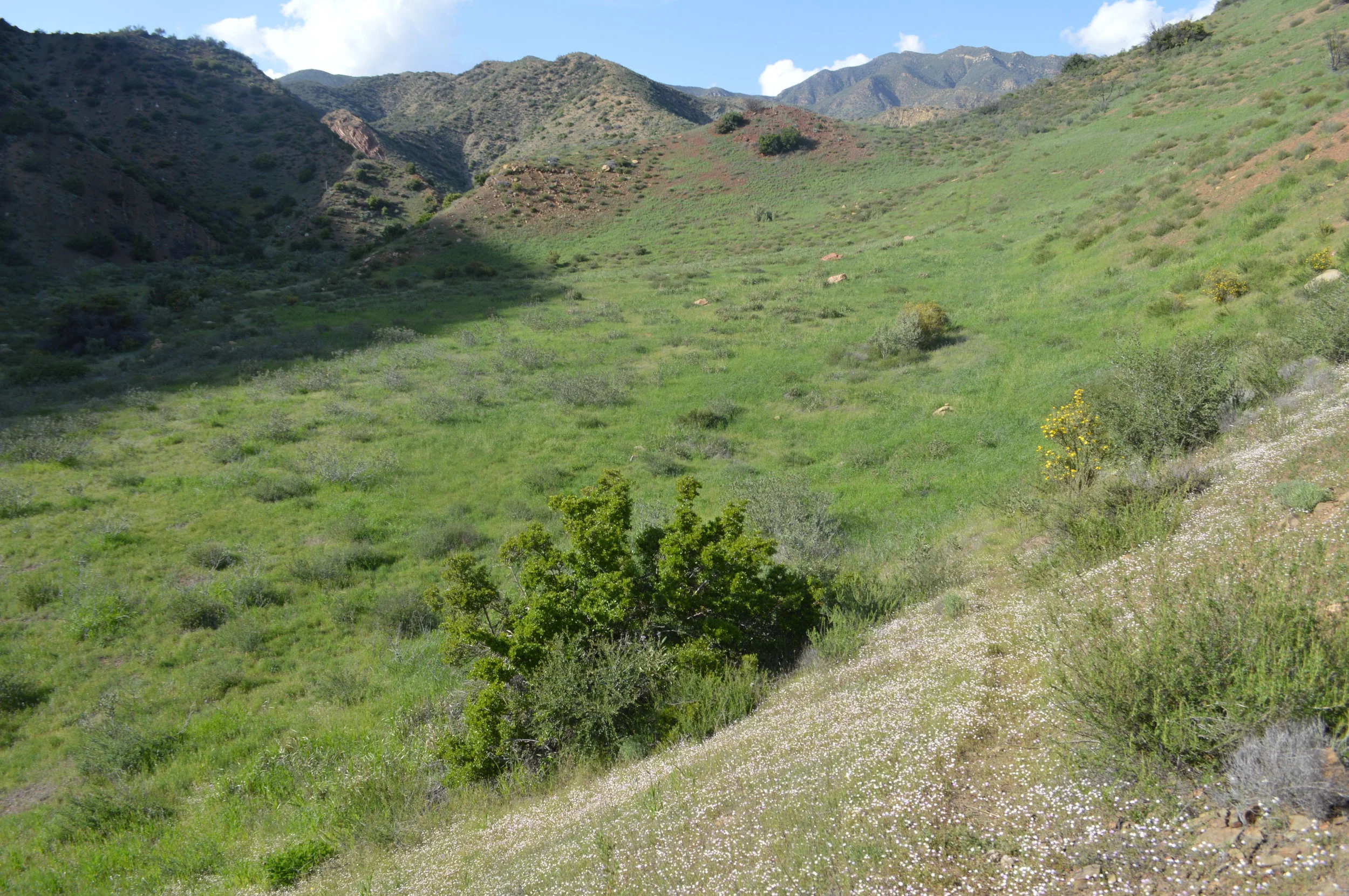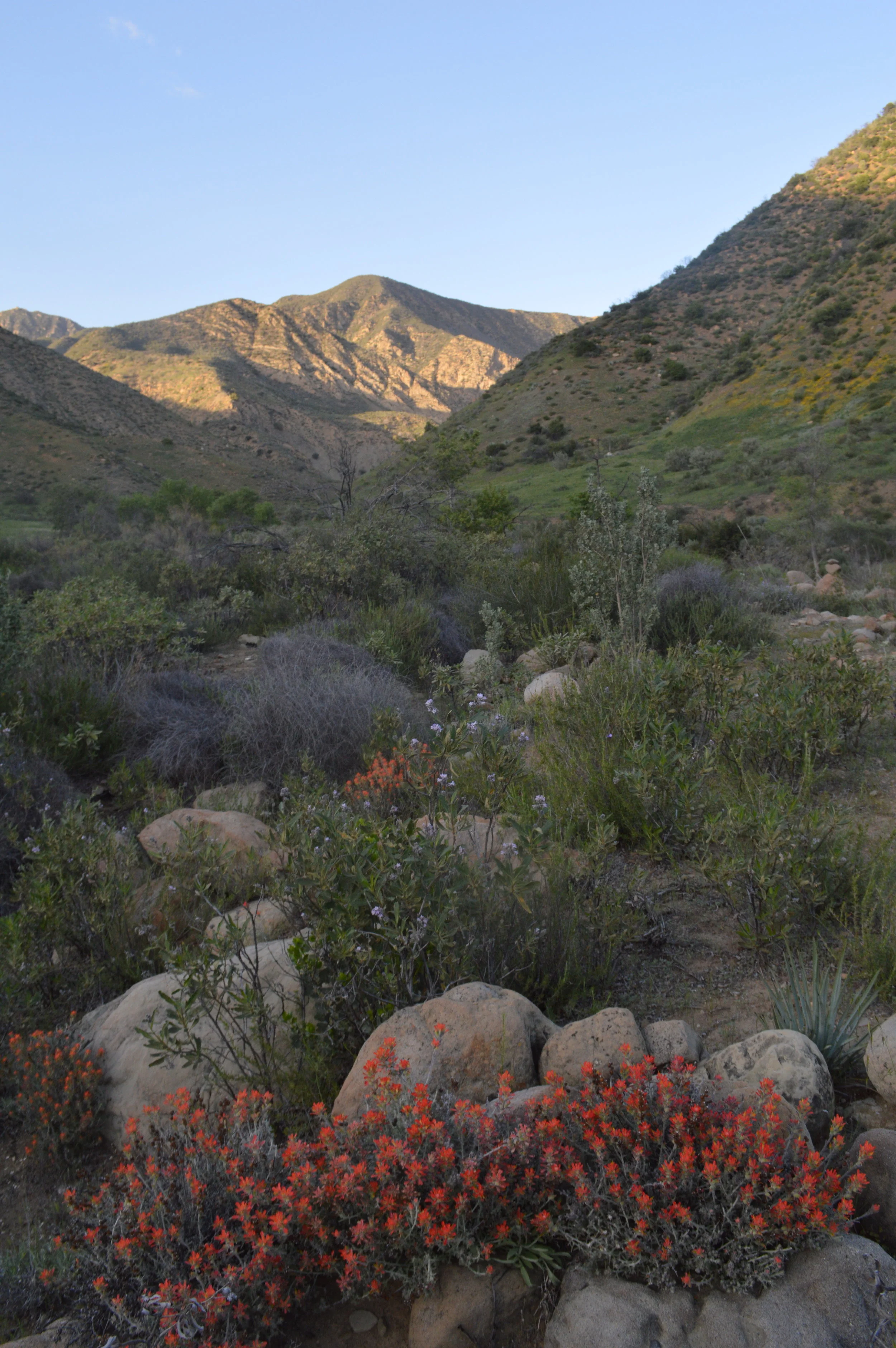 Upper Caliente Camp itself is mounted on a meadow-topped island in the divide between Agua Caliente Creek and a minor tributary. It’s surprisingly hard to find, but it’s there. From here, the canyon continues up, with another two miles available for further exploration. Each new bend in the canyon hides a new meadow, and each meadow bound by towering rock walls and side canyons leading into the unknown. Those who appreciate the beauty of our local geology will find in Agua Caliente a treasure trove of scenic cliffs and crags. In spring, Agua Caliente Canyon is the quintessence of the season, exploding with vibrant colors and alive with wildlife. Here, arroyo toads bounce fat and happy, not smashed and dead. When night falls on Agua Caliente, it is like being in a stadium with wildlife in the seats and you at the center — all around you ring the almost deafening din of nighttime songs.