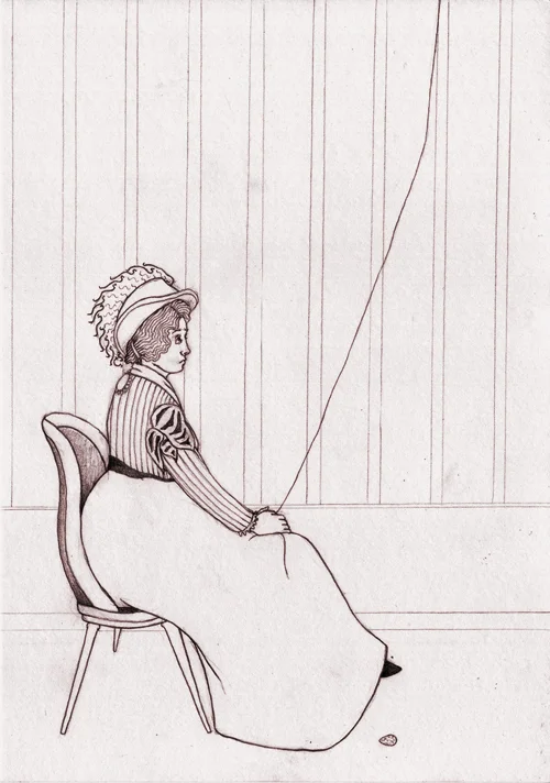 Until one day, when, having tired of contemplating the mocking greenery beyond the household walls, Elinor retired to her husband’s vast library, where she found, curiously tucked into one volume, a long, thin, black string, spooling from the pages. She opened the book to where this string was threaded and found there its termination; the rest of the string trailed to floor, to shelf, then seemingly to ceiling, then yet beyond, further up, threaded through the skylight and to the roof of the estate house. Like a cat she toyed with the string — a few tugs — and then left the mystery to rest.